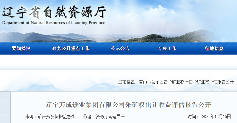 按照《關(guān)于完善礦業(yè)權(quán)出讓收益評估程序的通知》(遼自然資辦發(fā)[2022]2號)要求,《遼寧萬成鎂業(yè)集團(tuán)有限公司采礦權(quán)出讓收益評估報告》及相關(guān)附件已在省自然資源廳公示10個工作日,無異議,予以公開。
