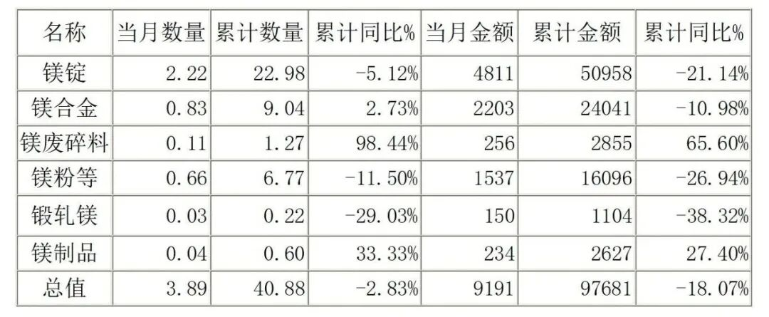 2025年1-11月中國各類鎂產(chǎn)品出口統(tǒng)計情況