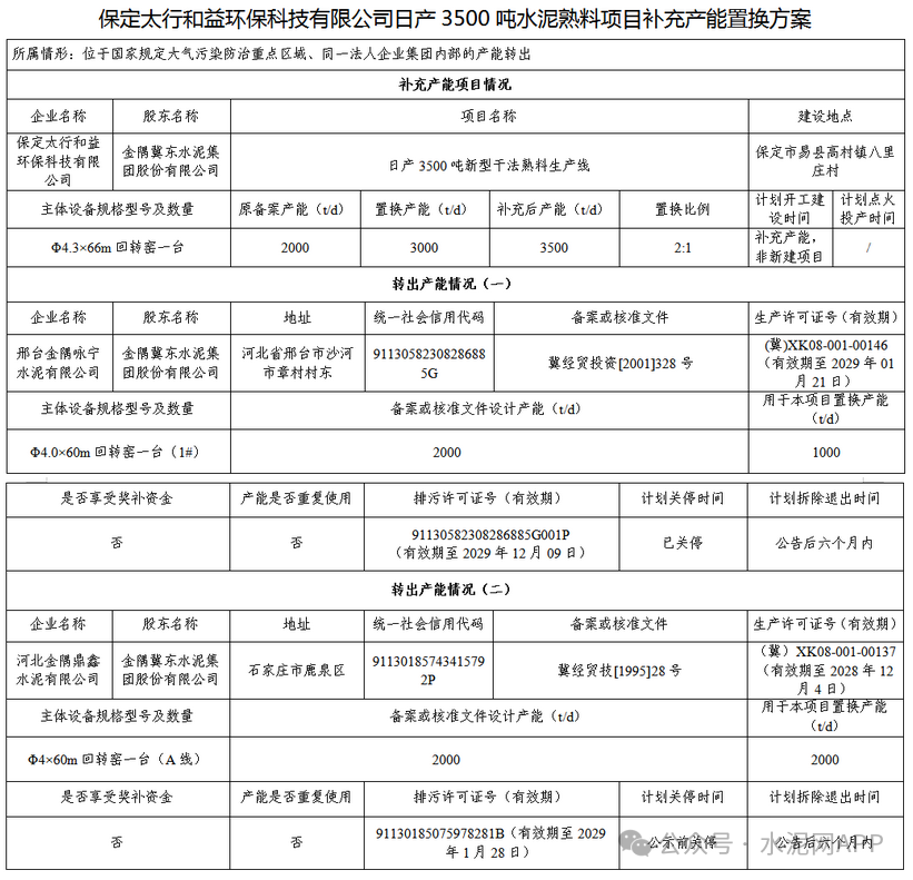 保定太行和益環(huán)??萍脊疽粭l2000t/d熟料生產(chǎn)線補(bǔ)充產(chǎn)能1500t/d,補(bǔ)齊后產(chǎn)能3500t/d,退出產(chǎn)能來自邢臺(tái)金隅詠寧水泥一條2000t/d熟料線(其中1000t/d用于本項(xiàng)目)、金隅鼎鑫水泥一條2000t/d熟料線,置換比例2:1。