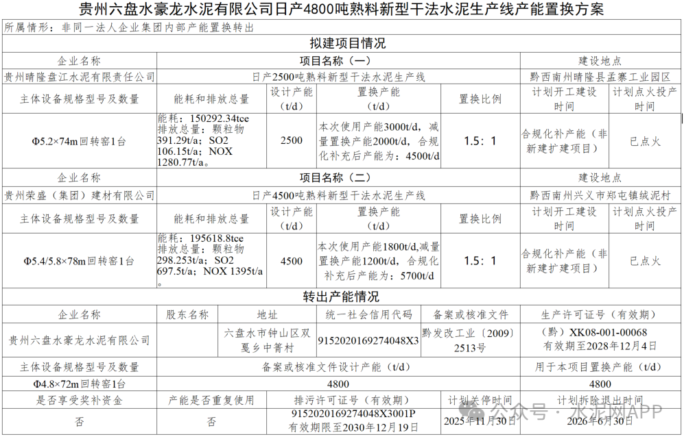 置換方案顯示,貴州六盤水豪龍水泥退出一條4800t/d熟料生產線,其中3000t/d產能用于補充貴州晴隆盤江水泥一條2500t/d熟料線,補齊后產能4500t/d,置換比例1.5:1;剩余1800t/d產能用于補充貴州榮盛建材一條4500t/d熟料生產線,補齊后產能5700t/d,置換比例1.5:1。