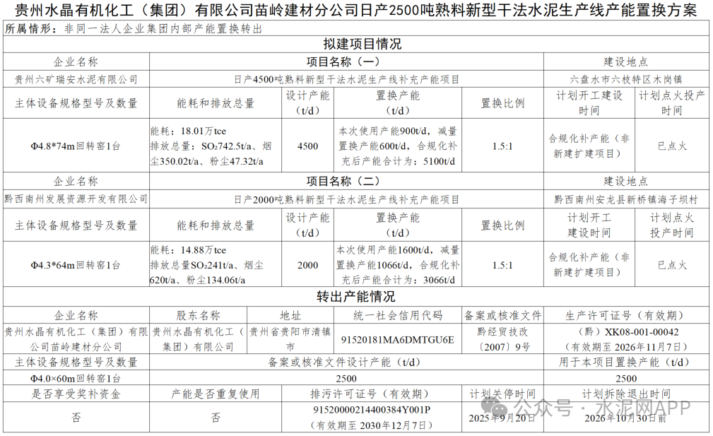 2025年12月31日,貴州省工信廳發(fā)布“關于貴州水晶有機化工(集團)有限公司苗嶺建材分公司日產(chǎn)2500噸熟料新型干法水泥生產(chǎn)線產(chǎn)能置換方案的公示”。