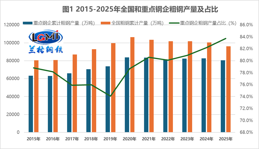 據(jù)中國(guó)鋼鐵工業(yè)協(xié)會(huì)權(quán)威統(tǒng)計(jì)數(shù)據(jù)顯示,2025年重點(diǎn)統(tǒng)計(jì)鋼鐵企業(yè)經(jīng)營(yíng)成績(jī)單亮點(diǎn)突出:累計(jì)營(yíng)業(yè)收入達(dá)6.1萬(wàn)億元,雖受鋼材價(jià)格震蕩下行影響同比下降 3.1%,但降幅顯著小于市場(chǎng)預(yù)期;營(yíng)業(yè)成本控制成效顯著,降至5.7萬(wàn)億元,同比下降4.5%,成本端收縮力度大于收入端回落幅度;利潤(rùn)總額實(shí)現(xiàn)1151億元,同比大幅增長(zhǎng)1.4倍,盈利規(guī)模實(shí)現(xiàn)跨越式修復(fù),成為行業(yè)發(fā)展的核心亮點(diǎn)。從鋼鐵產(chǎn)量來(lái)看,2025年重點(diǎn)鋼鐵企業(yè)在兼顧市場(chǎng)需求與供給優(yōu)化的前提下,產(chǎn)量結(jié)構(gòu)呈現(xiàn) "穩(wěn)中有調(diào)" 的特征;其中,重點(diǎn)鋼鐵企業(yè)粗鋼產(chǎn)量8.05億噸,占全國(guó)粗鋼總產(chǎn)量的83.8%,同比下降2.7%,累計(jì)日產(chǎn)220.46萬(wàn)噸;生鐵產(chǎn)量 7.32 億噸,占全國(guó)生鐵產(chǎn)量的87.6%,同比微降0.7%,累計(jì)日產(chǎn)200.56萬(wàn)噸;鋼材產(chǎn)量 8.26億噸,占全國(guó)鋼材產(chǎn)量的57.1%,同比增長(zhǎng)0.9%,累計(jì)日產(chǎn)226.22萬(wàn)噸。從2015-2025年長(zhǎng)期趨勢(shì)來(lái)看(詳見(jiàn)圖 1),重點(diǎn)鋼企粗鋼產(chǎn)量占全國(guó)比重呈現(xiàn)穩(wěn)步提升態(tài)勢(shì),從20159年的74.1% 逐步攀升至2025年的83.8%,反映出行業(yè)集中度持續(xù)優(yōu)化,頭部企業(yè)的規(guī)模優(yōu)勢(shì)與資源整合能力不斷凸顯。