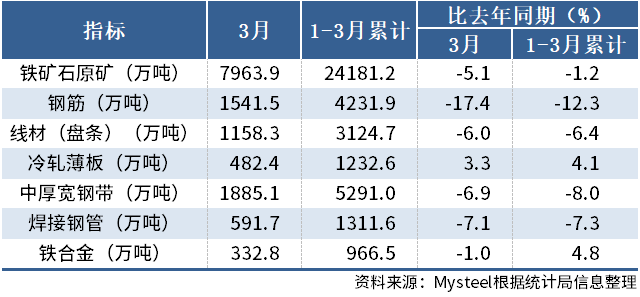 國家統(tǒng)計局最新數(shù)據(jù)顯示,2026年3月份,中國鋼筋產(chǎn)量為1541.5萬噸,同比下降17.4%;1-3月累計產(chǎn)量為4231.9萬噸,同比下降12.3%。3月份,中國中厚寬鋼帶產(chǎn)量為1885.1萬噸,同比下降6.9%;1-3月累計產(chǎn)量為5291.0萬噸,同比下降8.0%。3月份,中國線材(盤條)產(chǎn)量為1158.3萬噸,同比下降6.0%;1-3月累計產(chǎn)量為3124.7萬噸,同比下降6.4%。3月份,中國鐵礦石原礦產(chǎn)量為7963.9萬噸,同比下降5.1%;1-3月累計產(chǎn)量為24181.2萬噸,同比下降1.2%。