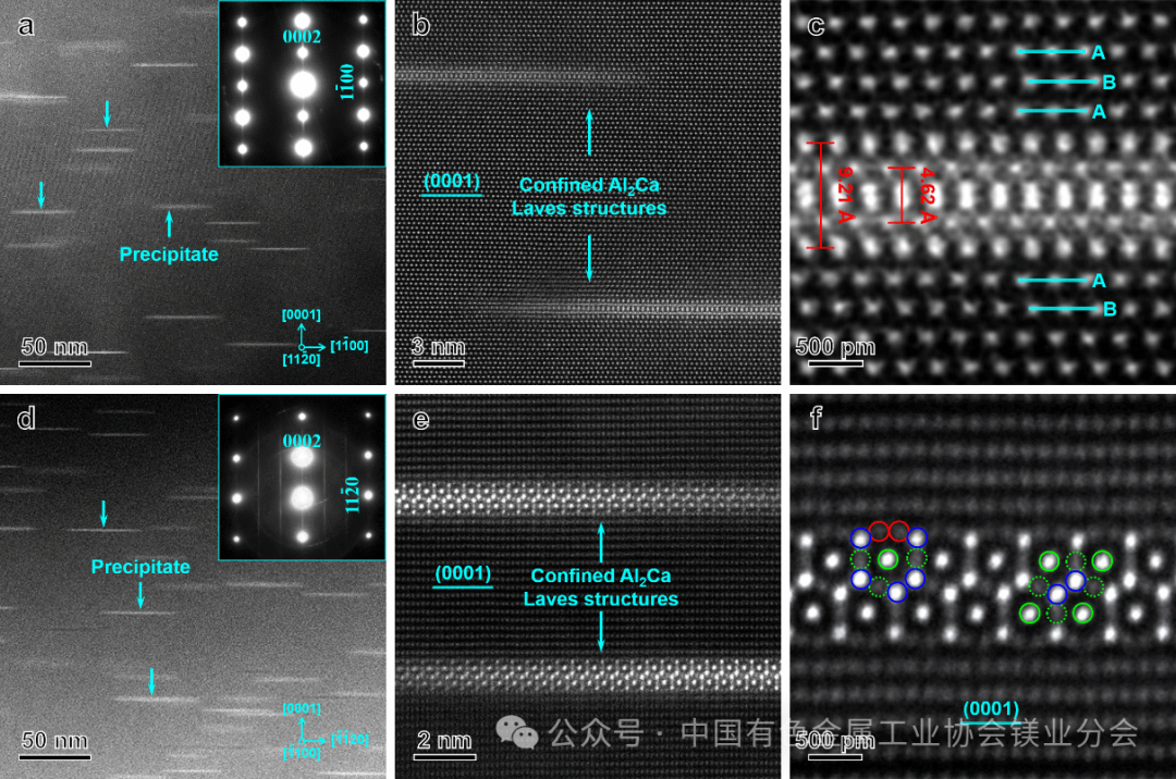 研究團(tuán)隊(duì)通過(guò)球差校正HAADF-STEM、原子分辨EDS、三維原子探針APT等表征手段以及第一性原理和分子動(dòng)力學(xué)模擬,在峰時(shí)效Mg-Al-Ca合金中首次直接觀察到一種嵌入鎂基體(0001)基面的受限二維Laves元結(jié)構(gòu)。該結(jié)構(gòu)核心厚度僅約4.62 ?,相當(dāng)于單層Laves構(gòu)筑單元;其內(nèi)部呈現(xiàn)類Al?Ca構(gòu)型,并在周圍Mg/Ca界面原子層的協(xié)同作用下實(shí)現(xiàn)原子尺度穩(wěn)定化。深入解析發(fā)現(xiàn)析出結(jié)構(gòu)周圍獨(dú)特的界面應(yīng)變能夠有效抑制Al原子沿[0001]α方向擴(kuò)散,從而限制析出相沿厚度方向長(zhǎng)大。該發(fā)現(xiàn)不僅為理解Laves結(jié)構(gòu)的形核、穩(wěn)定及相變機(jī)制提供了關(guān)鍵認(rèn)識(shí),也為Mg-Al-Ca合金時(shí)效析出行為調(diào)控及新型高強(qiáng)輕質(zhì)合金設(shè)計(jì)提供了重要理論依據(jù)。相關(guān)成果以“鎂合金中受限二維Laves結(jié)構(gòu)的原子特征與形成機(jī)制”Discovery of confined two-dimensional Laves tiling in a magnesium alloy為題發(fā)表于《自然-通訊》(Nature Communications)。我校分析測(cè)試中心謝紅波副研究員為第一作者,材料學(xué)院盧一平教授、沈陽(yáng)化工大學(xué)李?yuàn)檴櫜┦亢蜄|北大學(xué)馬先德博士為論文的通訊作者。