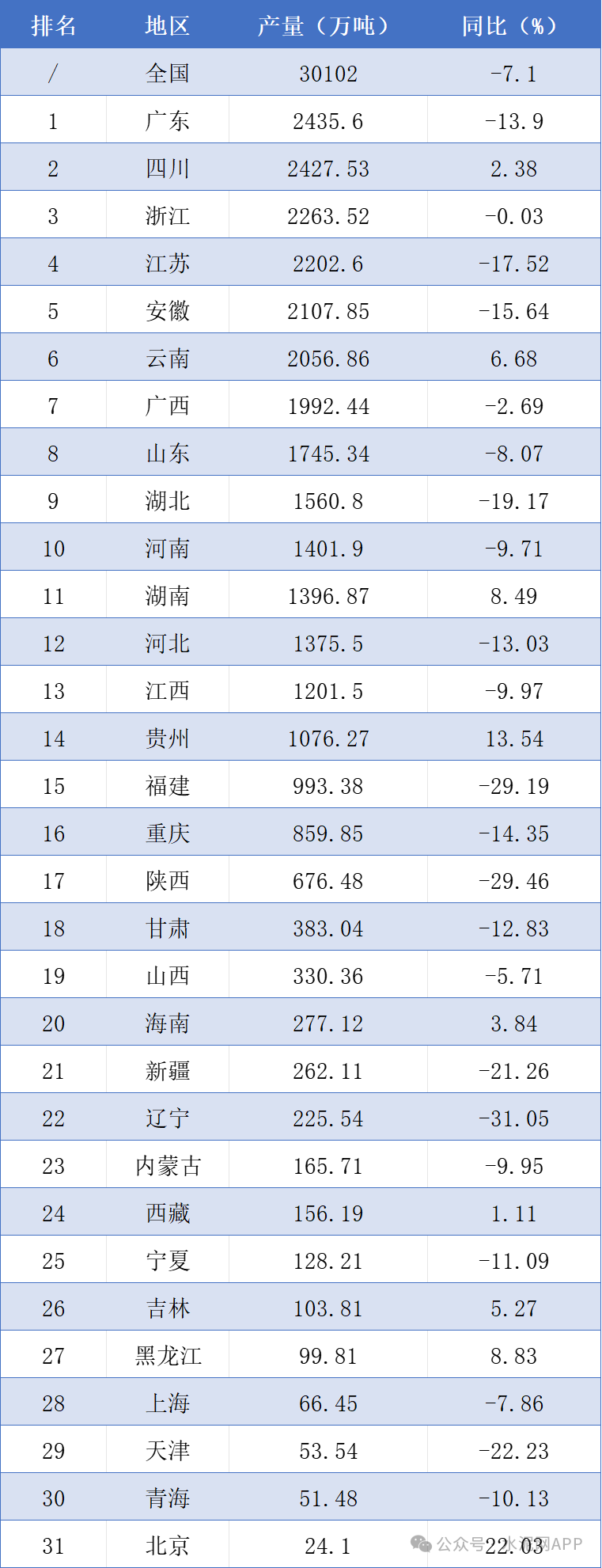 國家統(tǒng)計(jì)局?jǐn)?shù)據(jù)顯示,2026年一季度全國水泥產(chǎn)量30102萬噸,同比下降7.1%。從分省市數(shù)據(jù)來看,一季度廣東以產(chǎn)量2435.60萬噸位列第一,四川產(chǎn)量2427.53萬噸排在第二,浙江產(chǎn)量2263.52萬噸排在第三。同比來看,全國共9個(gè)地區(qū)上漲,22個(gè)地區(qū)下滑。