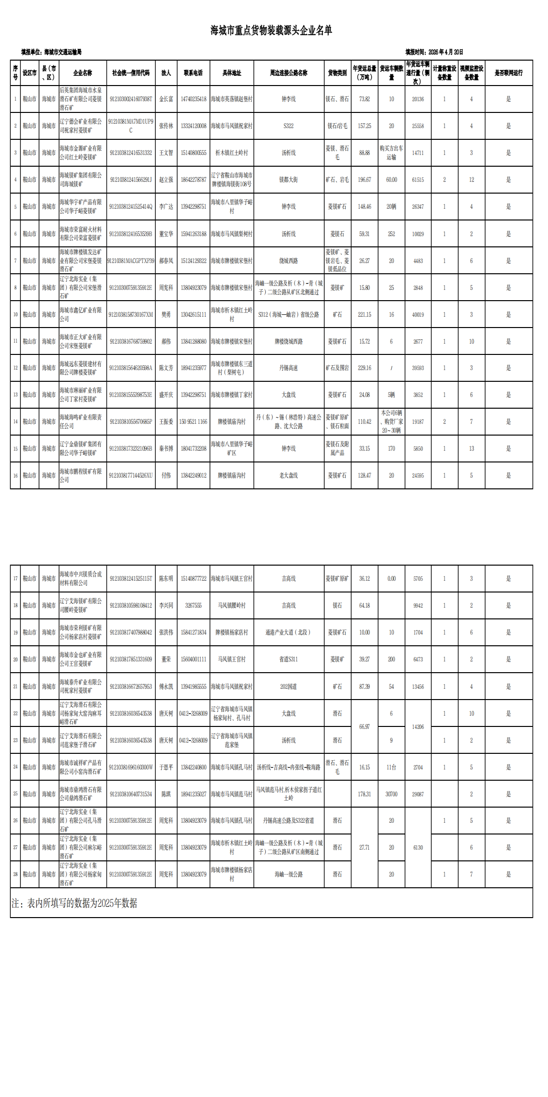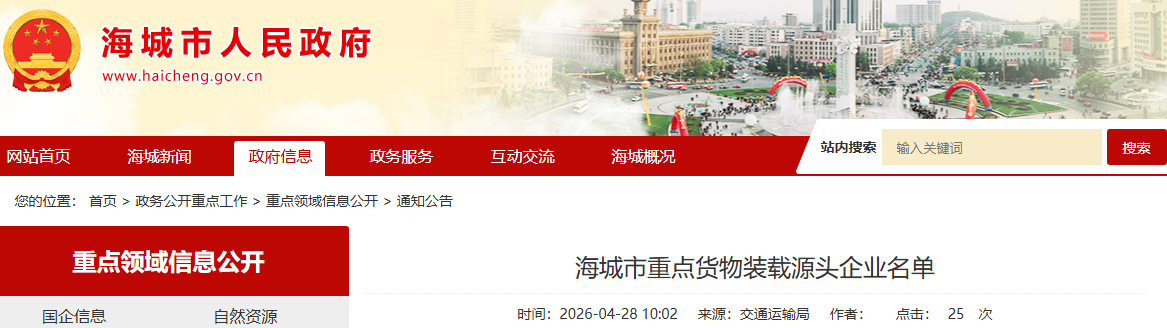 海城市公布重點(diǎn)貨物裝載源頭企業(yè)名單,主要貨物為菱鎂礦石